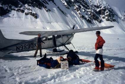 We are now on the Kahiltna Glacier (about 6,900 ft.). The time is 11:38 a.m. on the 28th of June, Friday. Cliff Hudson and his son, Jay, flew us in. One of Cliff's words of warning was that we had best stay roped up in view of the fact that two people have already died this year as the result of falling into crevasses... just as a result of not being roped up. One was the leader of a (German) party. Looking approximately east, judging from the sun angle, I can see the summit of McKinley. I said to Sam that it doesn't look too far away. He commented that I should be sure to put that on tape. We hear falling snow... right now... (avalanche). I slept perfectly abysmally last night (in Talkeetna) as I tried to think through my gear which seemed to me to be terribly disorganized, and I concluded as I wrestled with the problems that I was probably mentally unfit for this trip. I didn't take a sleeping pill last night or the night before and neither night did I get much sleep at all. I think one of the problems is just being wired. Larry says he's really wired too. |
